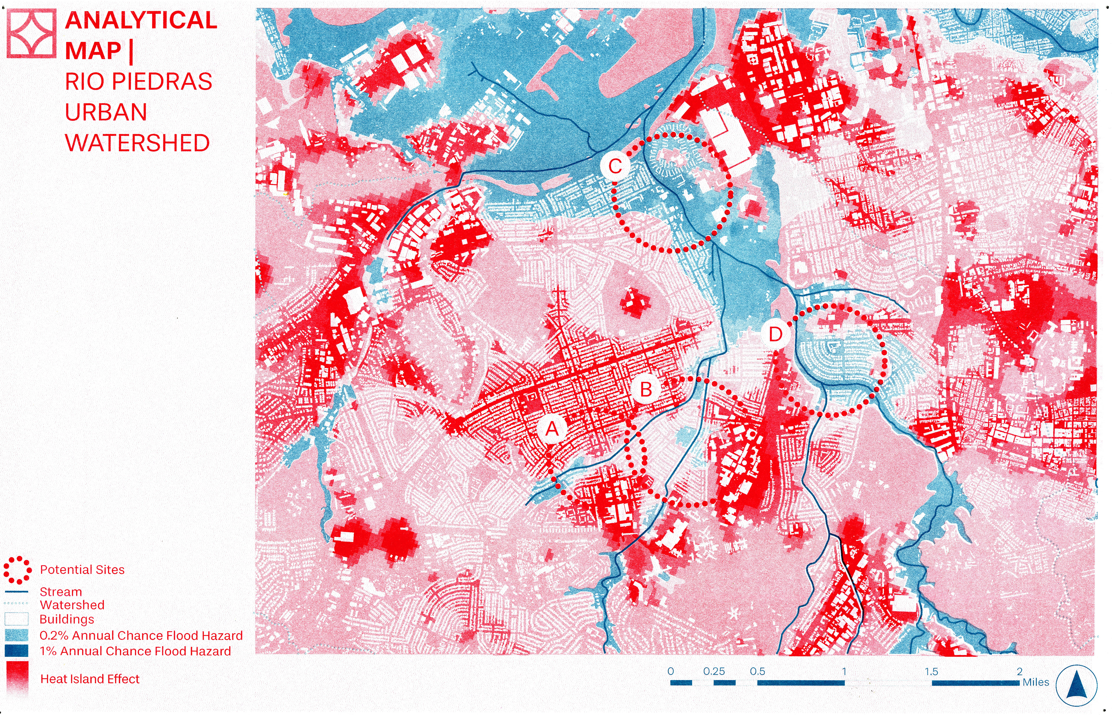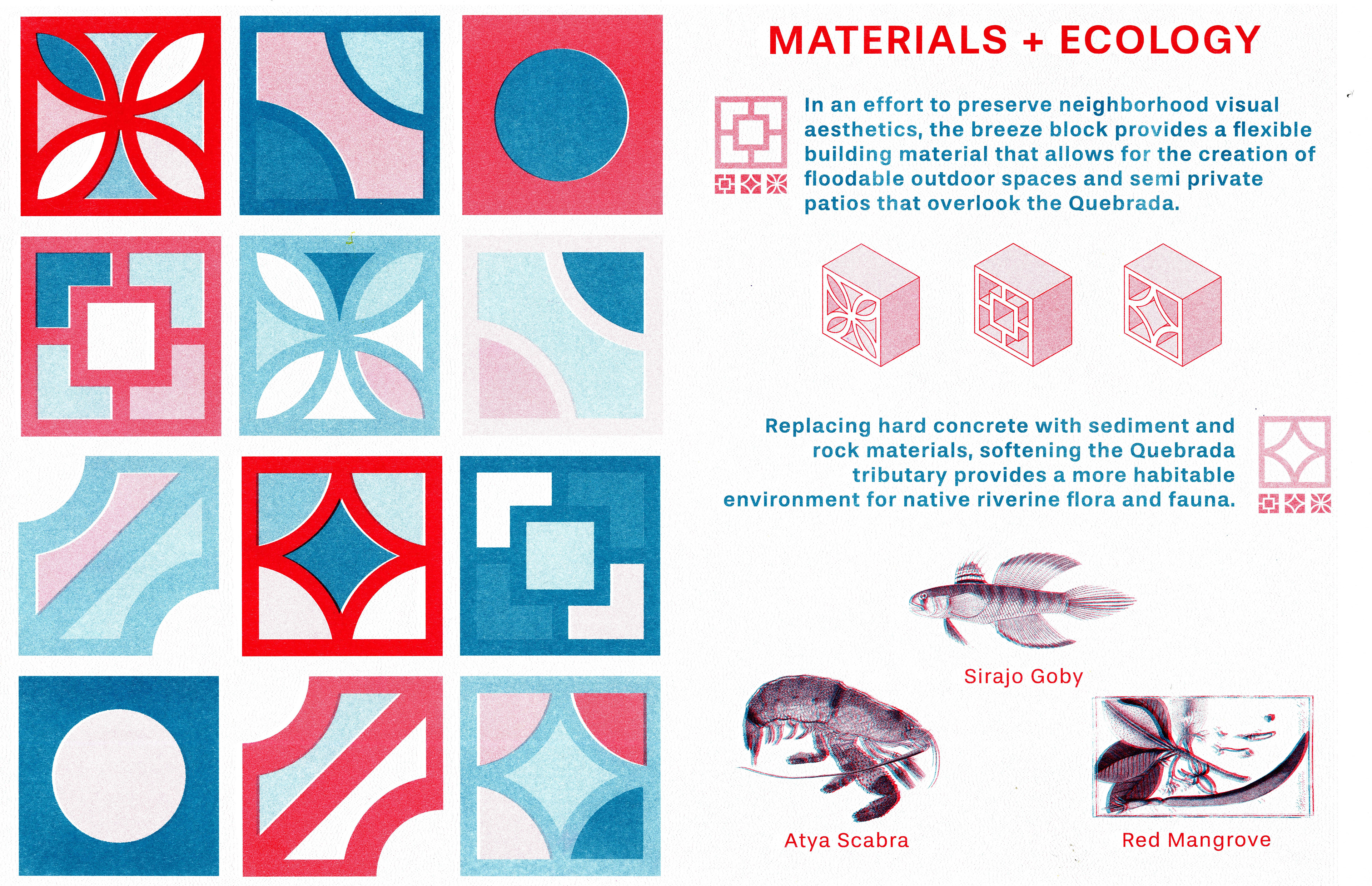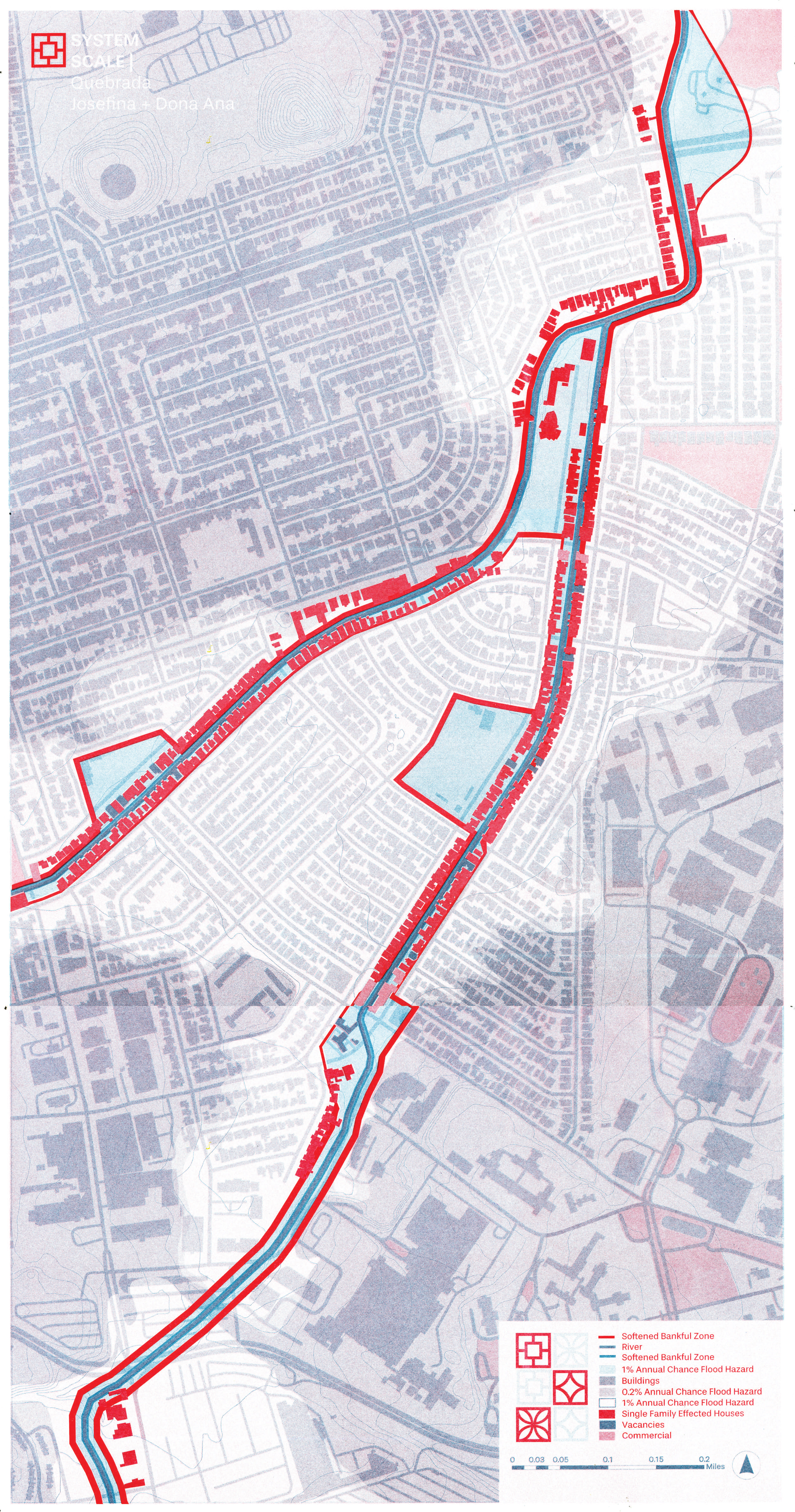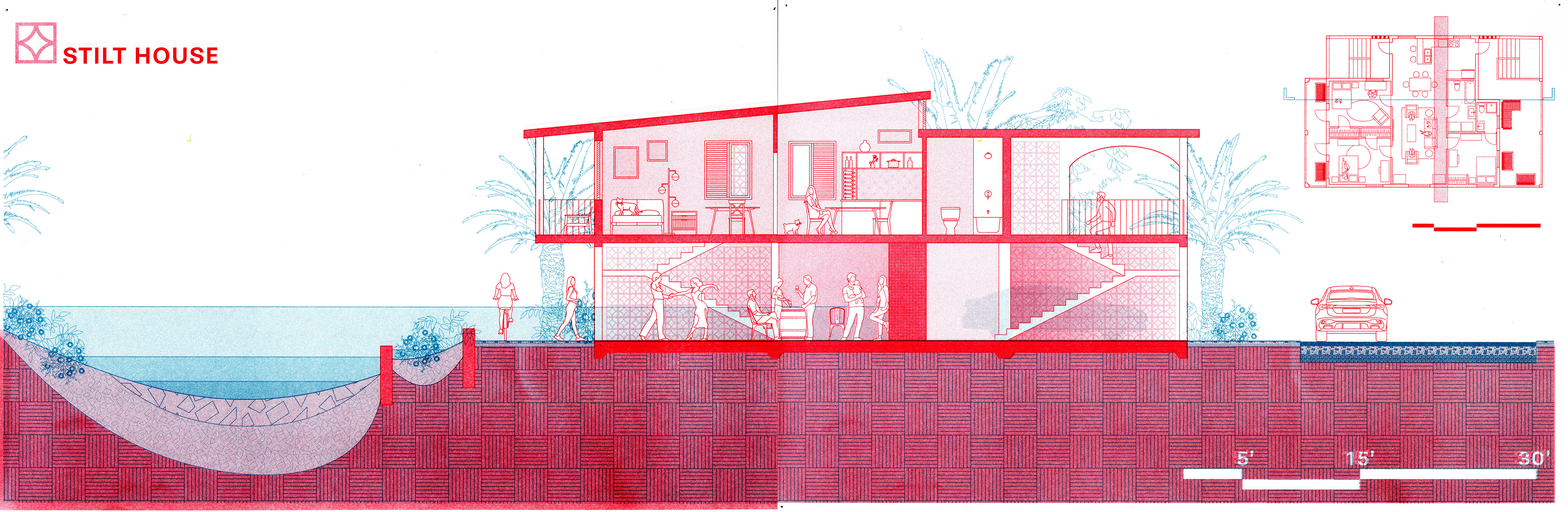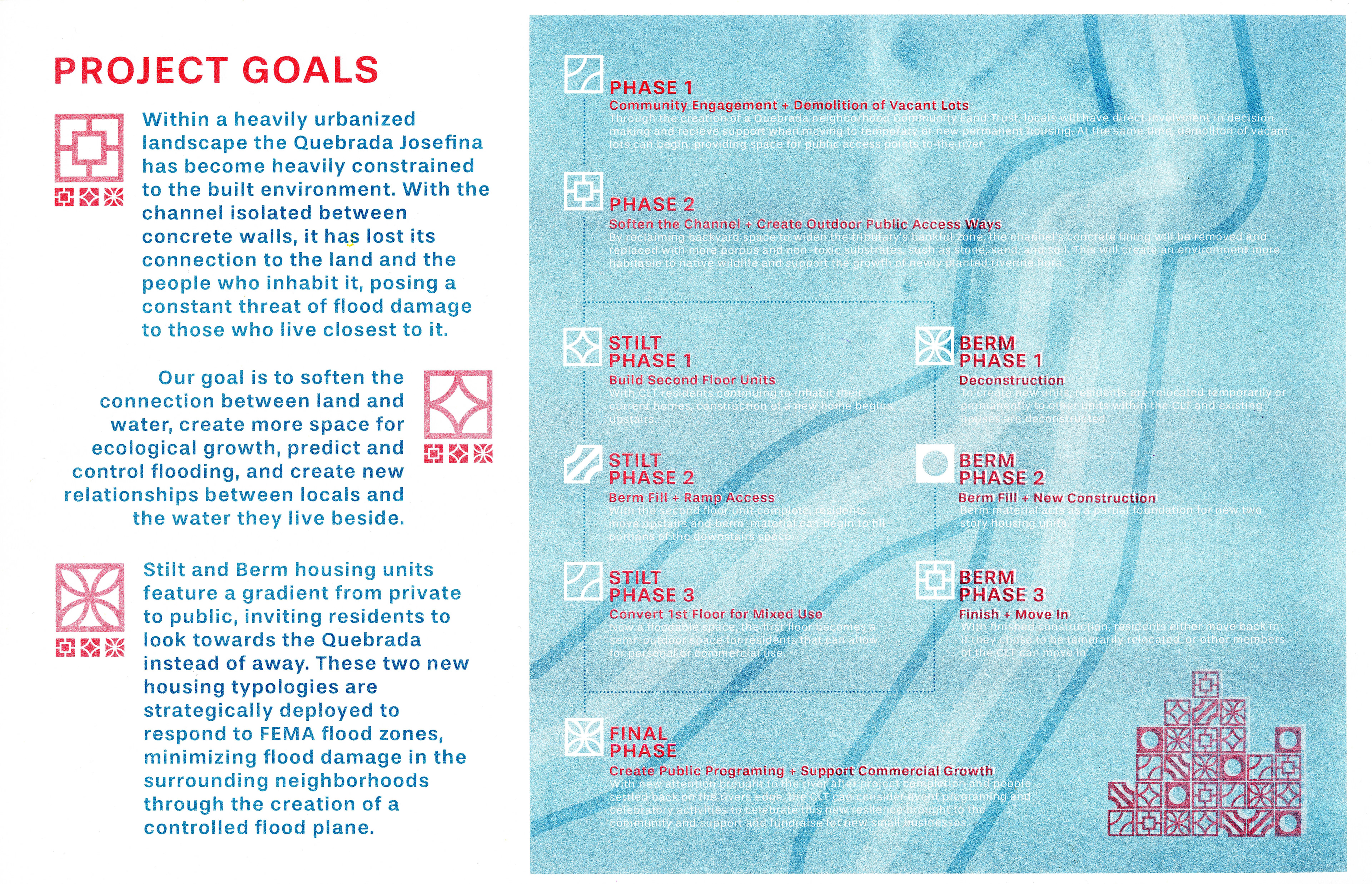 Stilt and berm housing units feature a gradient from private to public, inviting residents to look towards the Quebrada instead of away. These two new housing typologies are strategically deployed to respond to FEMA flood zones, minimizing flood damage in the surrounding neighborhoods through the creation of a controlled flood plane.